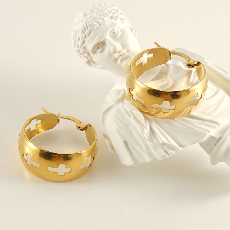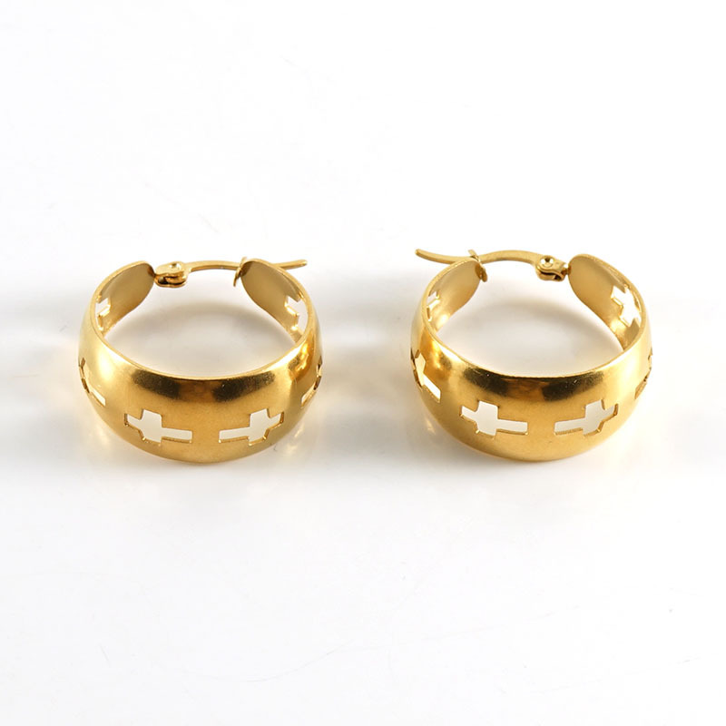 圆形镂空十字架耳环,304不锈钢,18K真金
