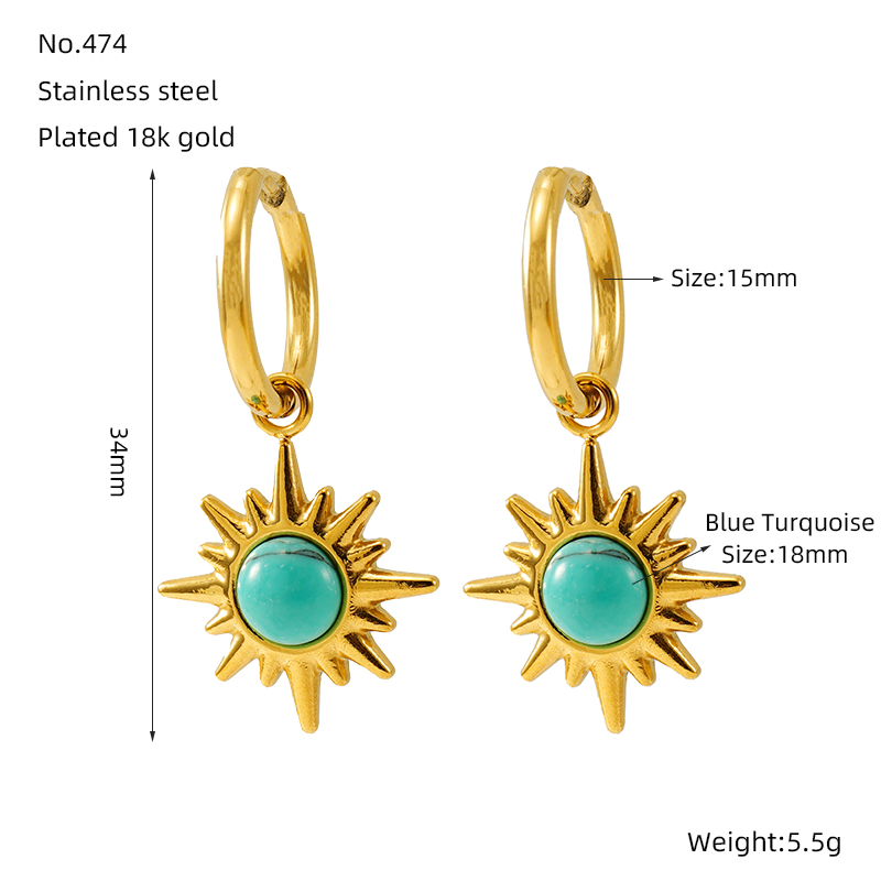 欧美INS风高级感蓝松石耳环女18K金色复古八芒星不锈钢耳饰批发,304不锈钢,18K真金