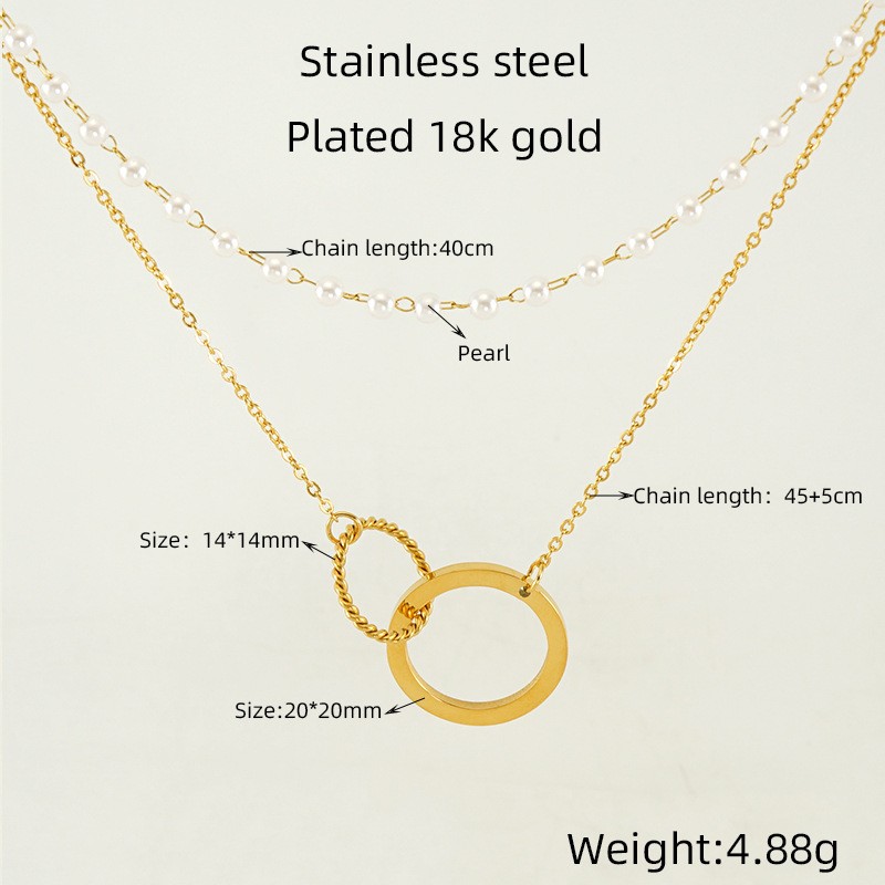 跨境爆款欧美小众设计感圆环镂空吊坠不锈钢双层珍珠项链女批发,304不锈钢,18K真金