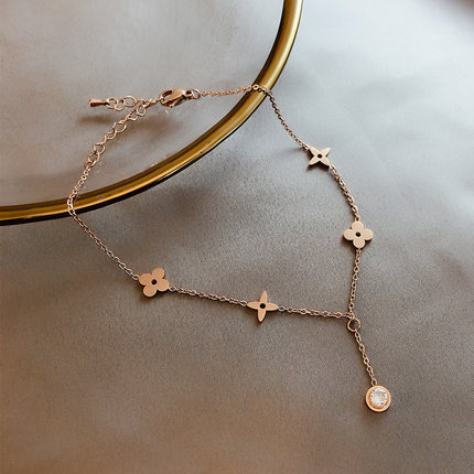 四个四叶草一个石托流苏脚链,304不锈钢,玫瑰金