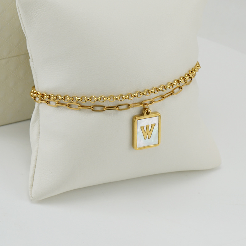 天然贝壳26字母拉拉手链,304不锈钢,18K真金