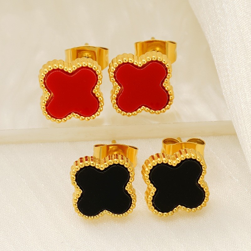 18K不锈钢四叶草耳钉,304不锈钢,18K真金 黑色亚克力