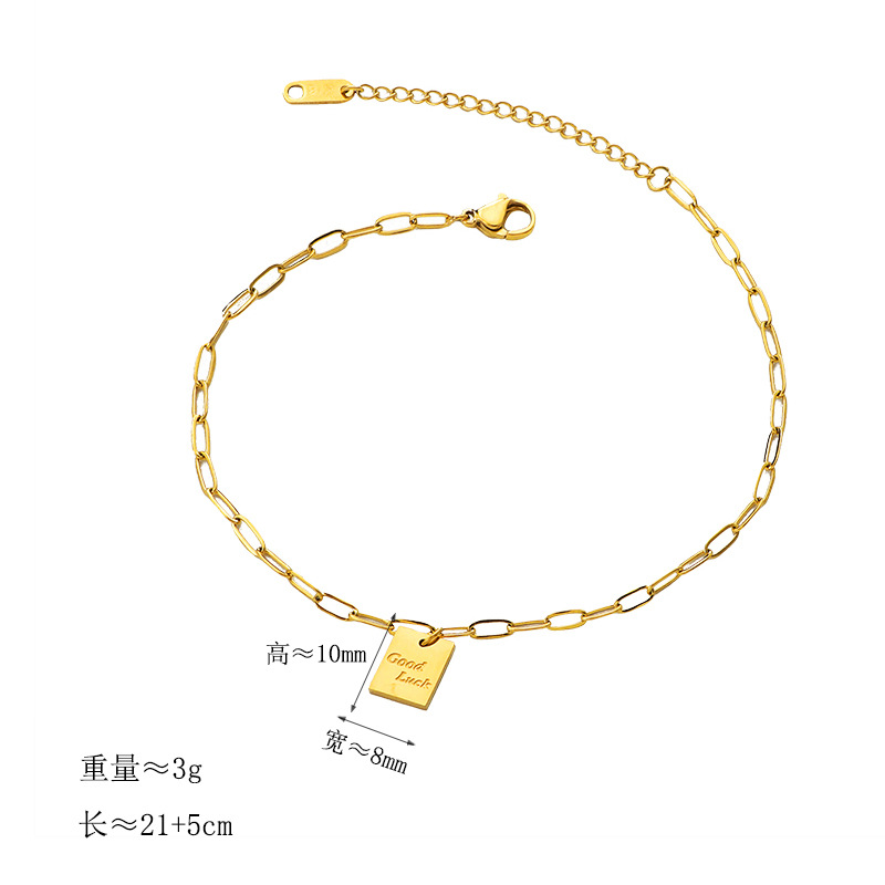 别针链Good luck方牌脚链,304不锈钢,18K真金