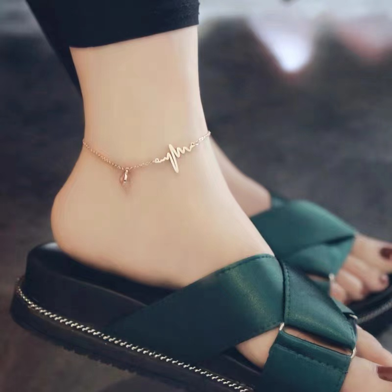 双层刀片链字母桃心脚链,304不锈钢,18K真金