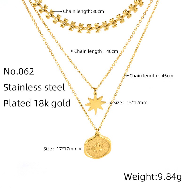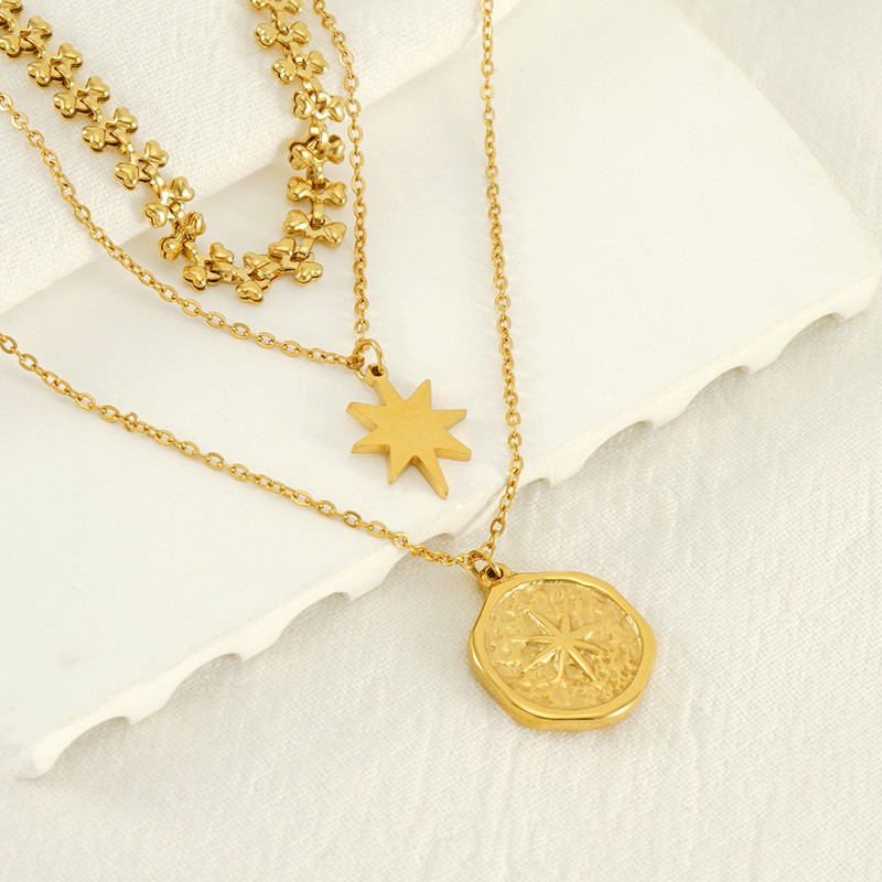 跨境欧美2024新款饰品个性气质百搭六芒星圆盘吊坠多层项链饰品女,304不锈钢,18K真金