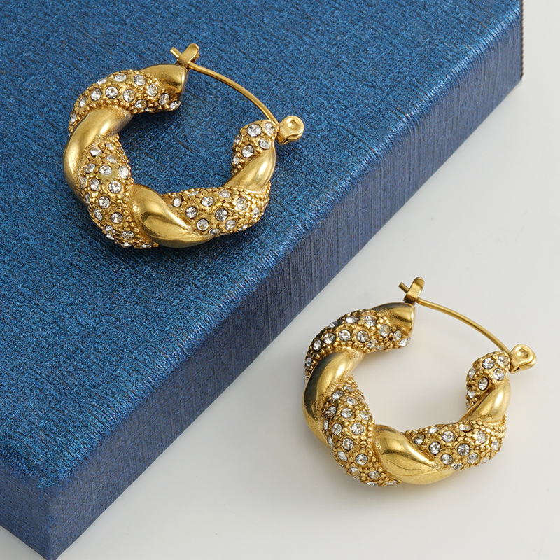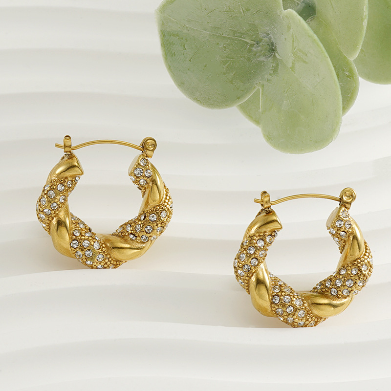 麻花镶钻耳环,304不锈钢,18K真金
