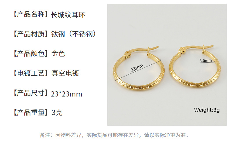 长城纹卡扣耳环,304不锈钢,18K真金 材质种类:不锈钢 | 商品编号:09562ZE160G