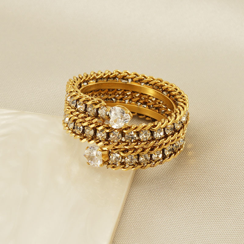 多层开口可调节戒指,304不锈钢,18K真金 白锆