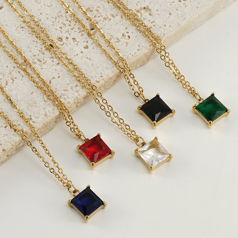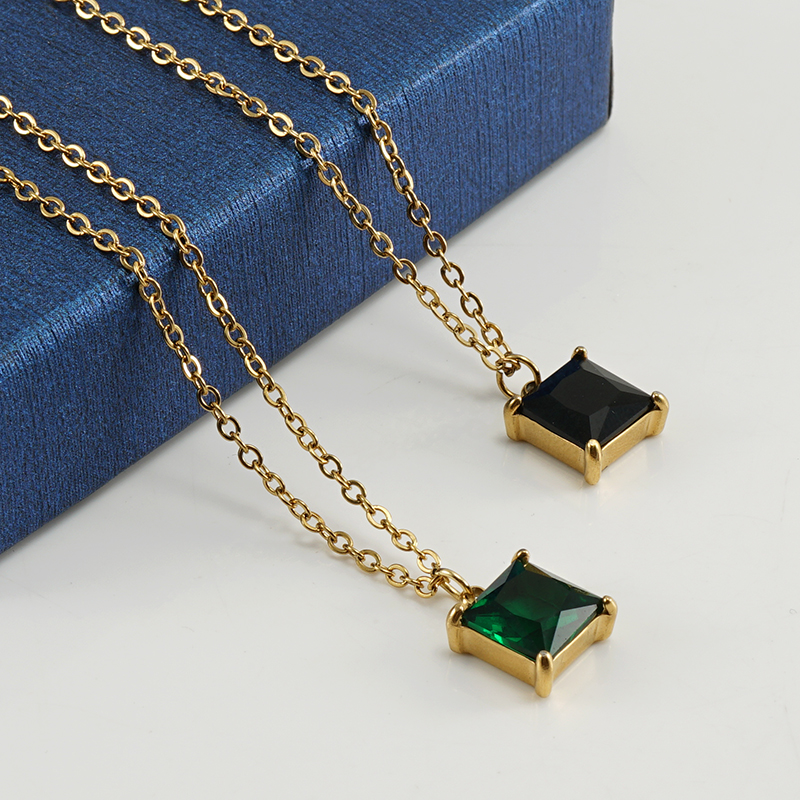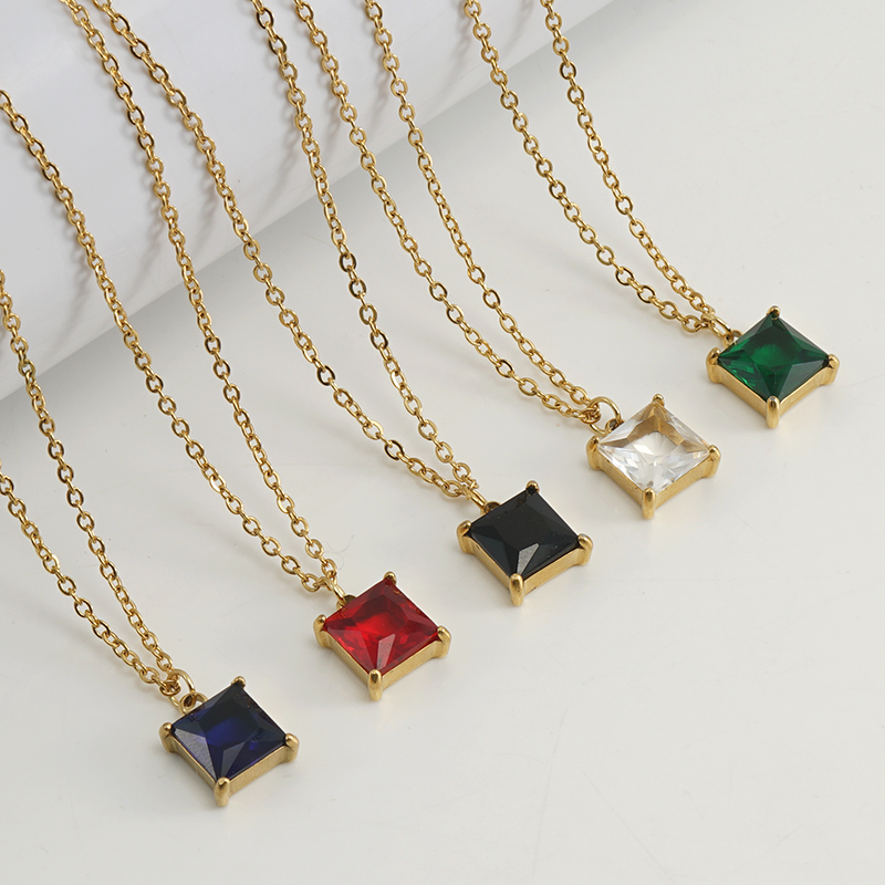 跨境欧美钛时尚多色锆石吊坠锁骨链18K金色不锈钢正方形ins项链女,304不锈钢,18K真金 锆石:黑皓