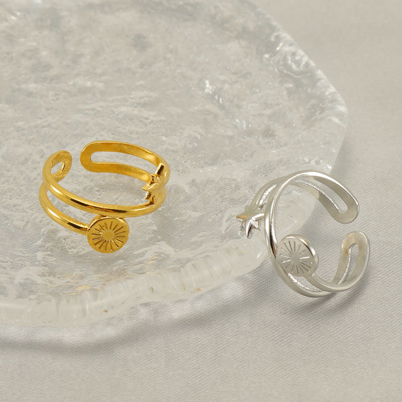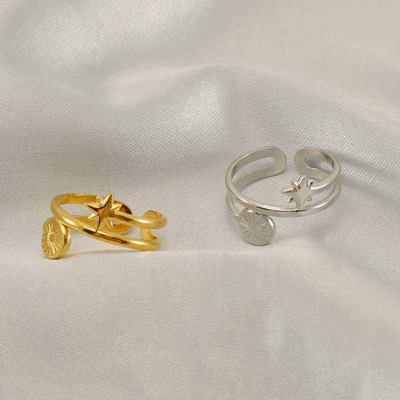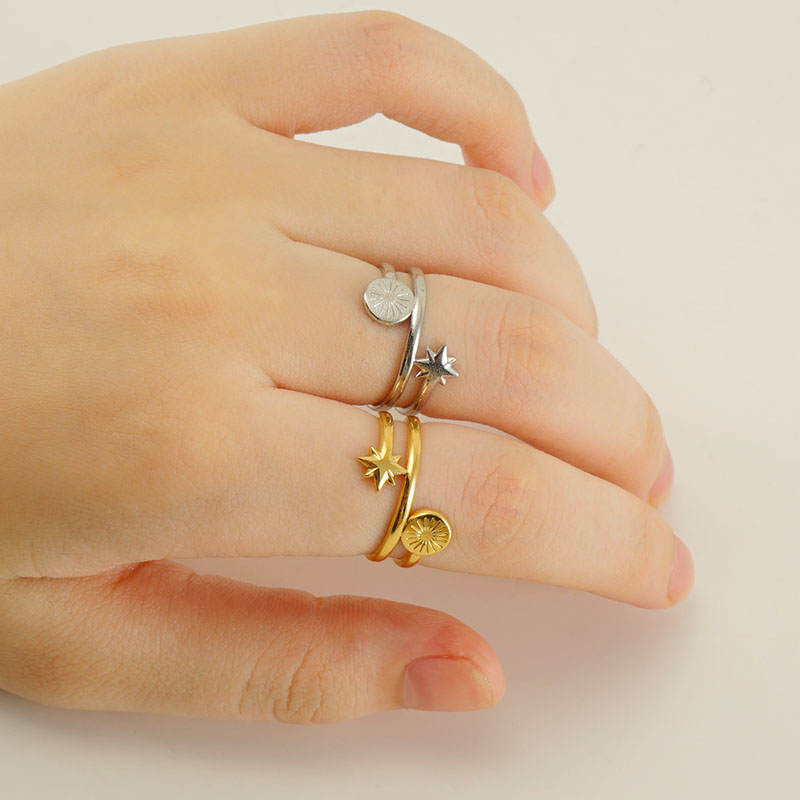 18K金星星太阳八芒星形不锈钢开口戒指,304不锈钢,钢色