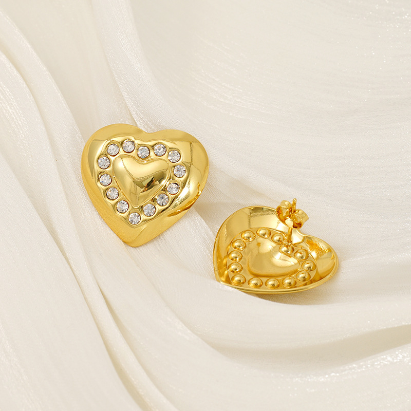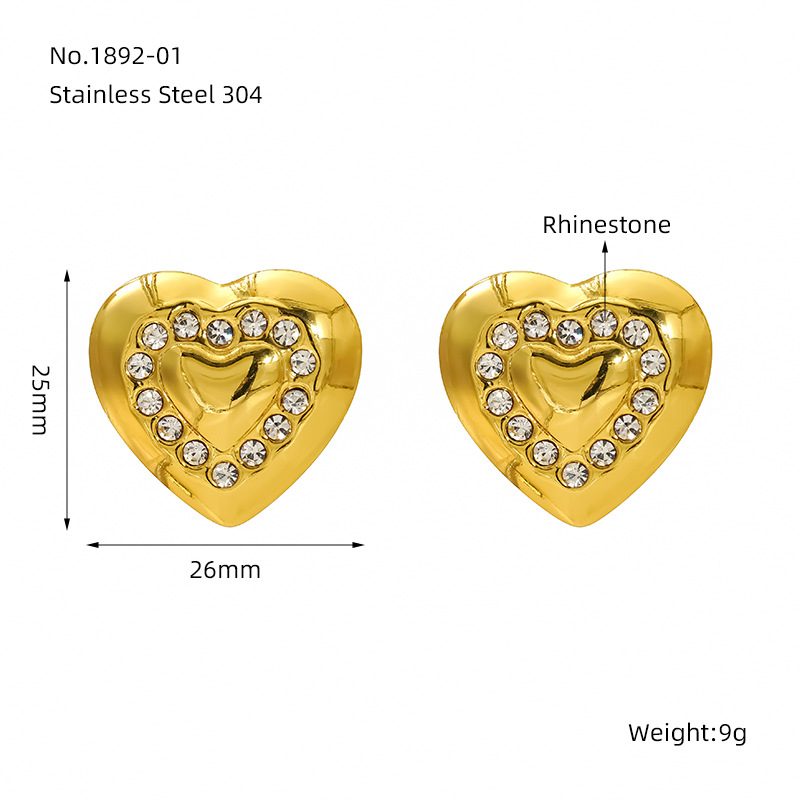珍珠爱心耳钉,304不锈钢,18K真金 水钻-国产石:白钻