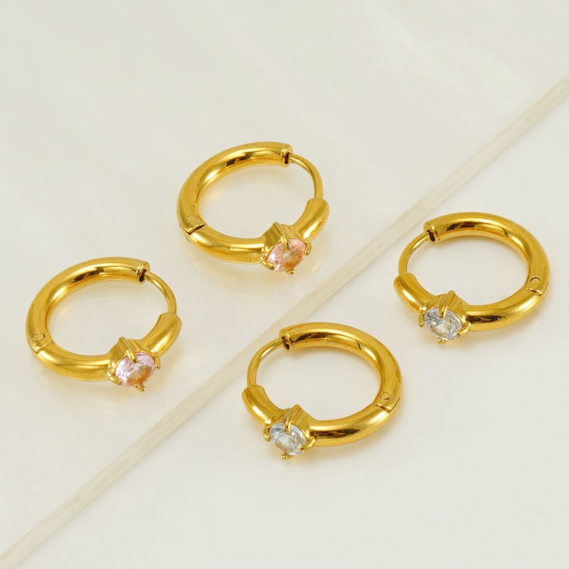 欧美INS风网红同款不锈钢耳环女镀18K金耳扣镶嵌彩色锆石耳圈女,304不锈钢,18K真金 白锆