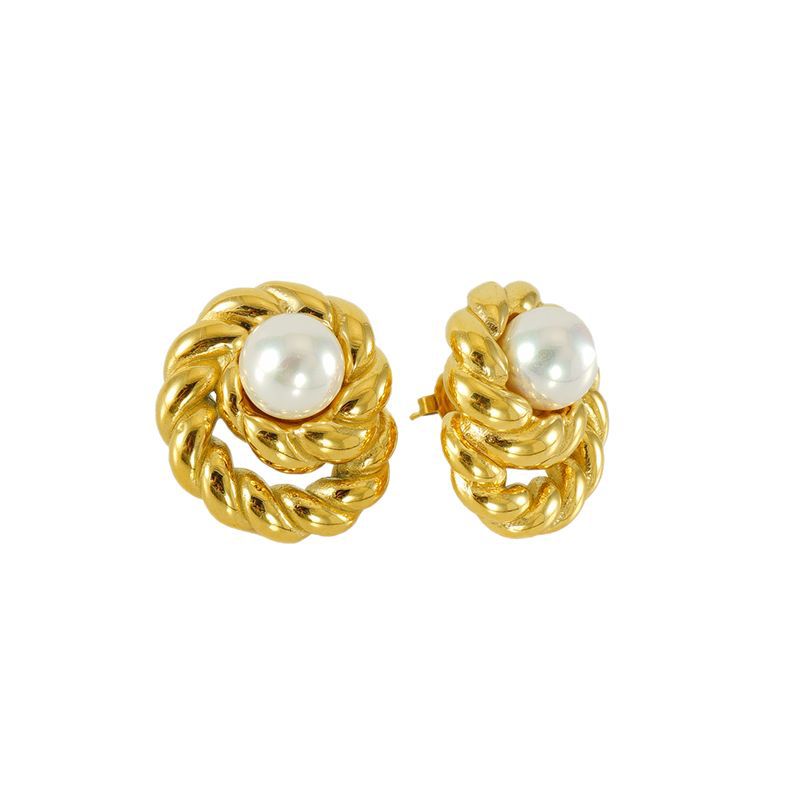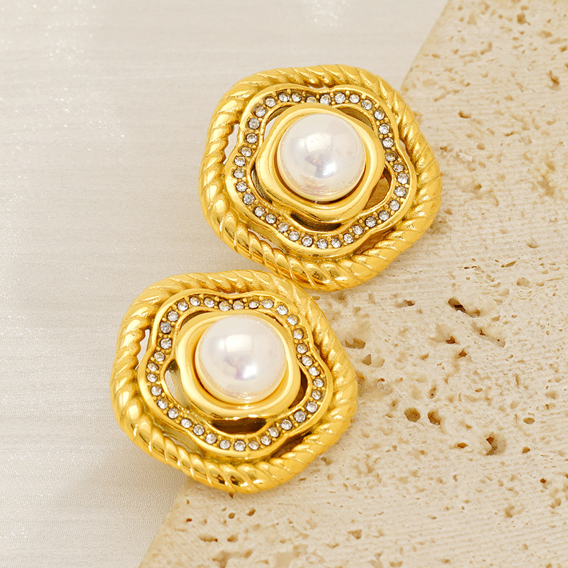 圆形镶嵌珍珠锆石耳钉,304不锈钢,18K真金