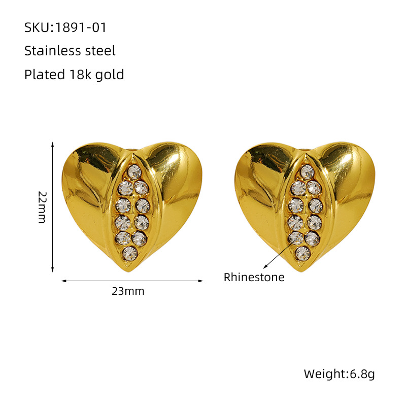 爱心耳钉,304不锈钢,18K真金 水钻-国产石:白钻