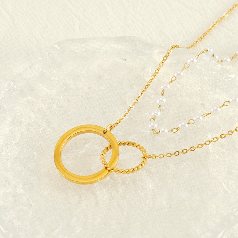 跨境爆款欧美小众设计感圆环镂空吊坠不锈钢双层珍珠项链女批发,304不锈钢,18K真金