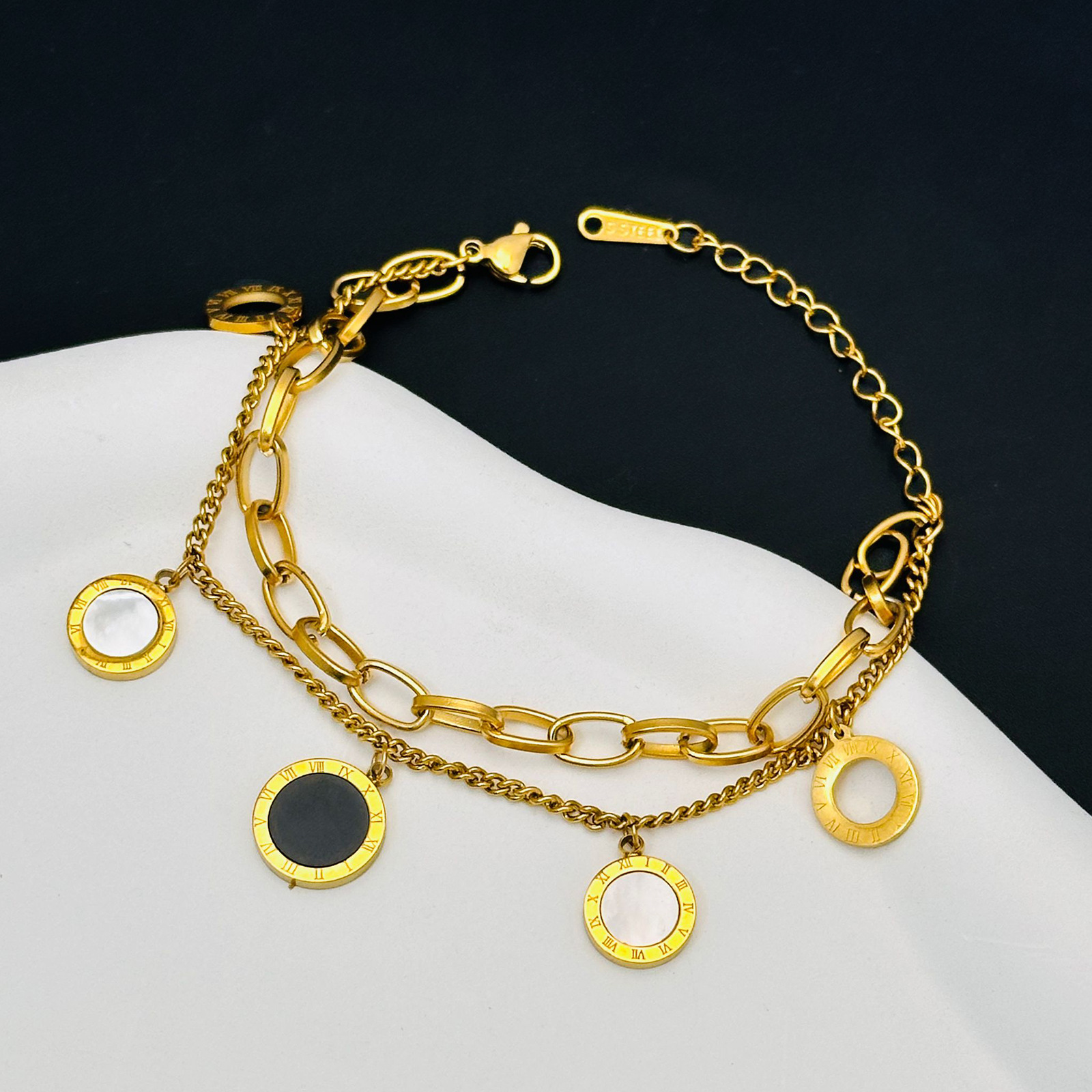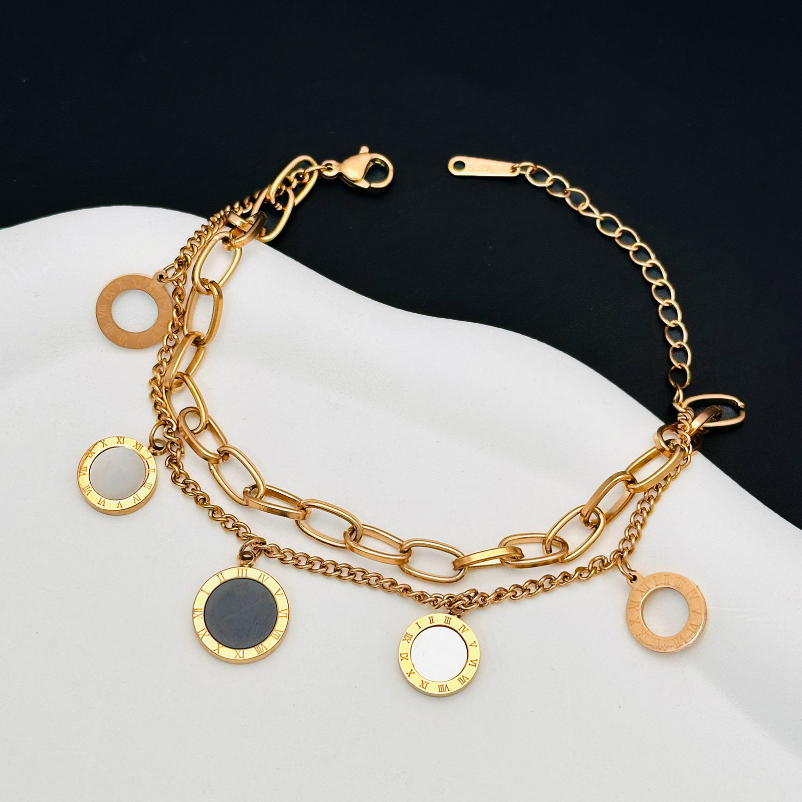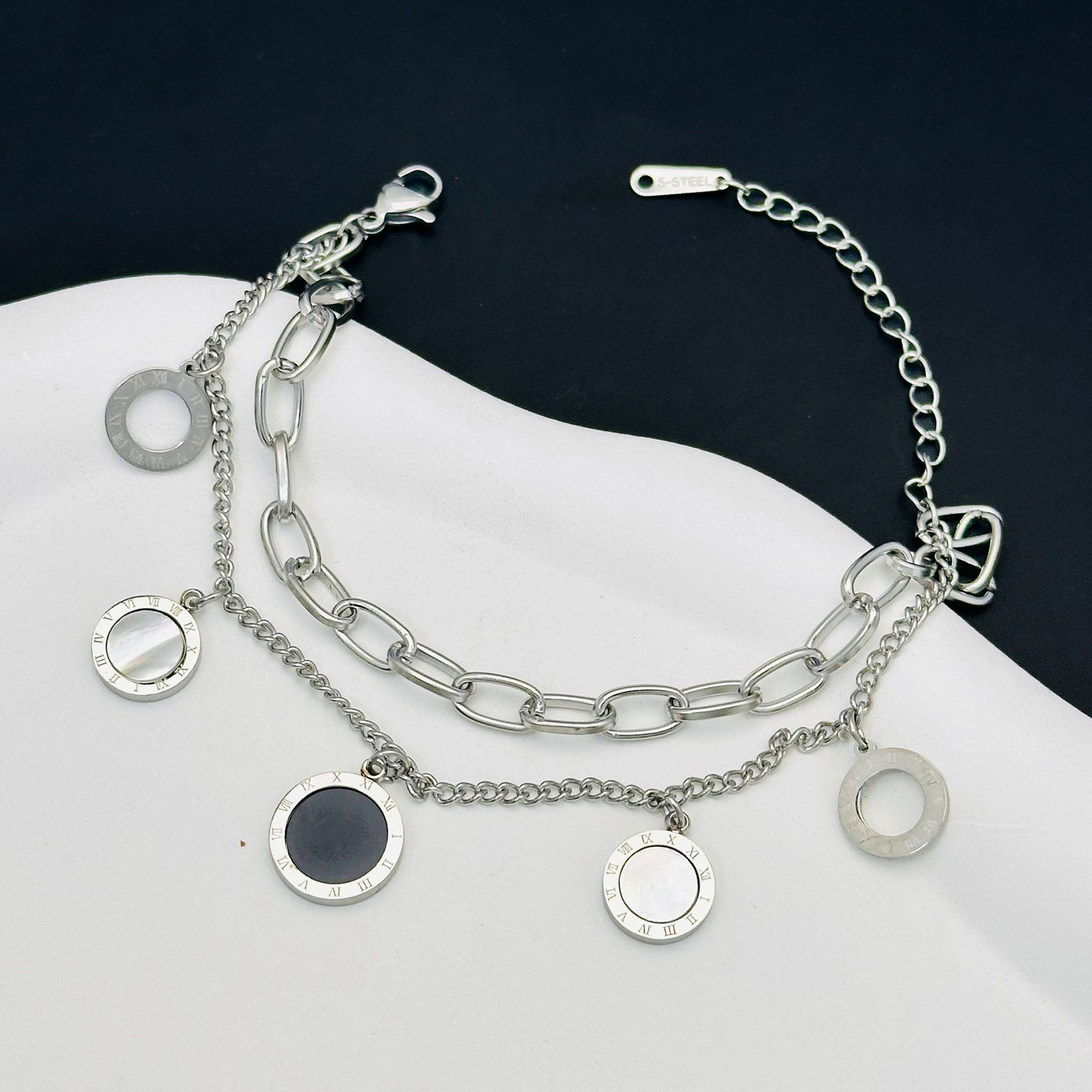 双层链三个贴贝两个镂空罗马圆手链,304不锈钢,钢色