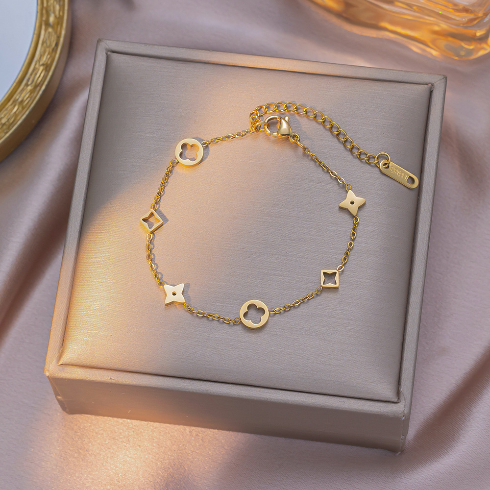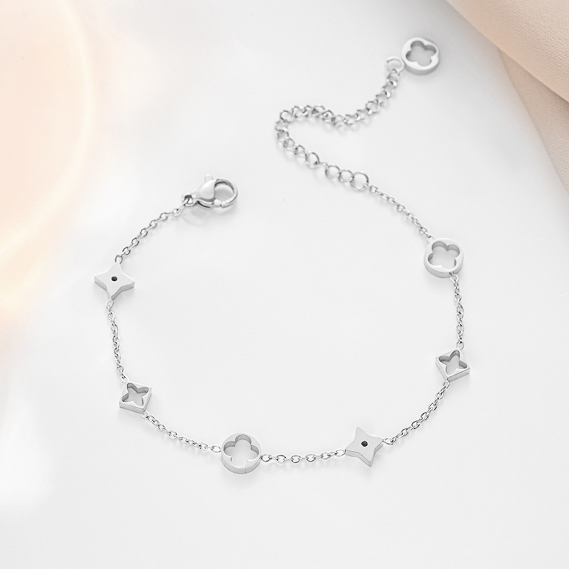 双层链五个镂空四叶草脚链,304不锈钢,钢色